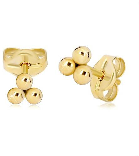 14K sárga arany fülbevaló, három összekapcsolt, kis golyóból. A felszíne fényes és sima. Biztonságos viselését stekker teszi lehetővé. Fülbevaló mérete: 4 x 4 mmFülbevaló súlya: 0,38 gFémjelzéssel ellátott. Az ár egy párra vonatkozik.
