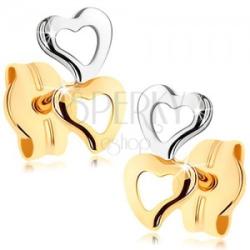 375 arany fülbevaló sima fényes felülettel, két szimmetrikus szívkontúrból, melyek egymás alá vannak helyezve. A felső körvonal ezüst színű, ródiummal kezelt felület. Alatta található a másik kontúr arany színben. A fülbevaló hátlapja üreges. Biztonságos viselését a stekker biztosítja. A fülbevaló méretei: 3,5 x 7 mmA fülbevaló súlya: 0,2 gFémjelzéssel elláto