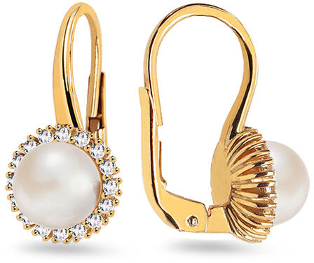 Elegáns ékszer, amely magával hozza a gyöngy - Biwa szépségét és jellegzetes csillogását, amelyet tiszta cirkon vesz körül. A fülbevalók sárga aranyból kovácsoltak, ez a gyöngykombináció tökéletesen kiemelkedik.