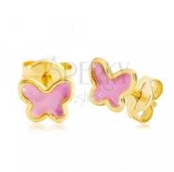 A 14K sárga arany fülbevaló kicsi pillangó alakú, amelynek közepét fényes rózsaszín fénymáz tölti ki. A pillangó arany széle keskeny és enyhén kiemelt. Biztonságos viselését stekker teszi lehetővé. Fülbevaló méretei: 5 x 4 mmFülbevaló súlya: 0,3 gFémjelzéssel ellátott. Az ár egy párra vonatkozik.