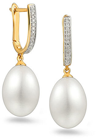 Elegáns sárga aranyból készült fülbevaló, gyémántokkal és édesvízi Biwa gyöngyökkel díszítve, fehér színű. Huszonhat 0,080 ct össztömegű, H színű és SI1 tisztaságú gyémánt díszíti őket. A gyöngyök a legjobb minőségűek, ovális alakúak, bársonyos fényűek. A fülbevalók angol rögzítését alkalmazzák, amely megfelel a biztonság és a kényelmes viselet k