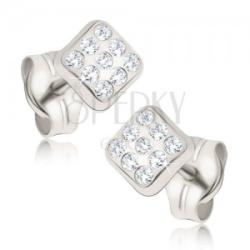Fülbevaló 14K fehér aranyból apró fényes négyzetekkel és enyhén kidomborodó felszínnel. A négyzet kis kerek átlátszó cirkóniákkal van kirakva. Beszúrós. A fülbevaló méretei: 4 x 4 mmA fülbevaló súlya: 0,4 gFémjelzéssel ellátott. Az ár egy párra vonatkozik.