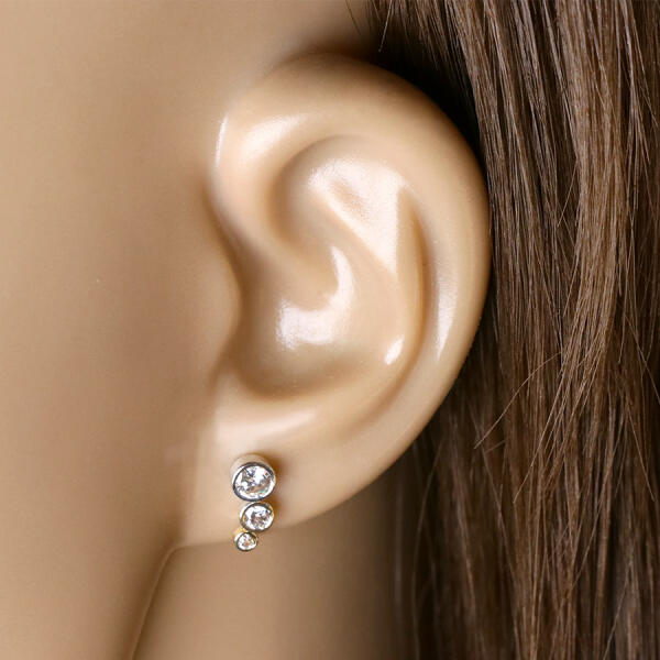 A 14K kombinált arany fülbevalót három vékony sima foglalat alkotja, amelyek a legnagyobbtól a legkisebb felé haladva vannak elrendezve. Csiszolt átlátszó cirkóniák vannak a foglalatokba ágyazva. Fülbevaló stekkeres zárszerkezettel. A fülbevaló mérete: 4 x 10 mmA fülbevaló súlya: 0,8 gFémjelzéssel ellátva. Az ár egy párra vonatkozik.