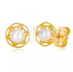 A 14K sárga arany fülbevalót díszesen kivágott hatszirmú virág alkotja keskeny karikában. A virág közepében egy fehér színű mesterségesen tenyésztett, enyhén lapos gyöngy helyezkedik el. Biztonságos viselését stekker teszi lehetővé. Fülbevaló méretei: 6 x 6 mmGyöngy átmérője: 3 mm Fülbevaló súlya: 0,3 g Fémjelzéssel ellátott. Az ár egy párra vonatkozik. A teny