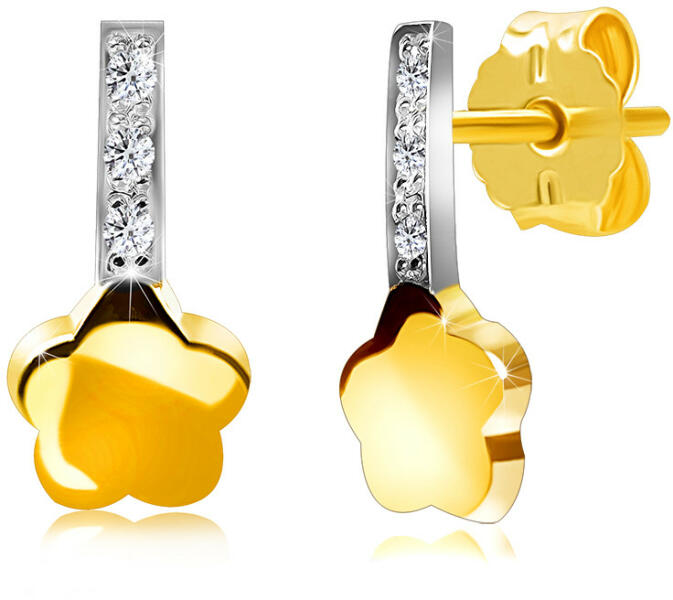 A 375 sárga aranyból készült briliáns fülbevaló egy csík, amelyet kerek, tiszta briliánsok díszítenek. A csíkra egy kis virág van erősítve, amelynek felülete sima és tükörfényes. A fülbevaló ródiummal bevont felülettel és stekkeres zárral rendelkezik. A fülbevaló méretei: 4,5 x 9 mm A gyémántok teljes karát súlya: 0,027 ct Tisztaság: SI Szín: H A fülbevaló súl
