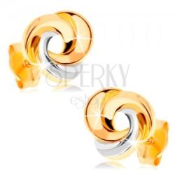 Beszúrós fülbevaló 14K aranyból három fényes lekerekített sima karika alakban, melyek egymással összefonódnak és csomót alkotnak. Két karika sárga aranyból készült és a harmadik fehér arany. A fülbevaló kapcsolása stekkeres. A fülbevaló mérete: 7 x 7 mmSúly: 0,5 gFémjelzéssel ellátott. Az ár egy párra vonatkozik.