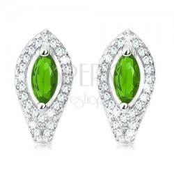 925 ezüst fülbevaló, amely búzaszem alakú és smaragdzöld színű csiszolt cirkóniából áll, csillogó, valamint kerek formájú, átlászó cirkóniás körvonallal van díszítve. A fülbevaló orosz zárral kapcsolódik. A fülbevaló méretei: 7 x 14 mmA fülbevaló súlya: 2,9 gFémjelzéssel ellátott. Az ár egy párra vonatkozik.