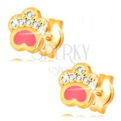 Az 585 arany, stekkeres fülbevalót egy mancs alkotja, amelynek az alsó része fényes, rózsaszín fénymázzal van díszítve. A felső részben kerek, átlátszó cirkóniák vannak beültetve. Biztonságos viselését stekker teszi lehetővé. Fülbevaló méretei: 7 x 6 mmFülbevaló súlya: 0,4 gFémjelzéssel ellátott. Az ár egy párra vonatkozik.