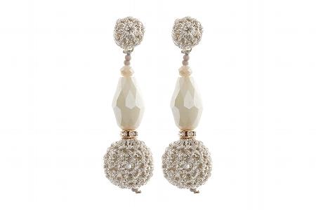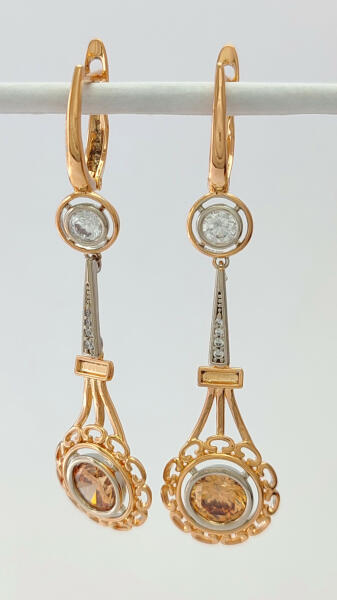 Arany-ezüstszínű fülbevaló, melyet áttört mintás függő díszít, fehér és napsárga cirkónia kristályok teszik csillogóvá. A kristályok karmos, ragasztott, peremezett foglalatban helyezkednek el. Tartós ékszer, fürdéskor nem kell levenni, nem feketedik ("gold filled"). Antiallergén ékszer. 18K arany-ezüst színben kapható. Fülbevaló teljes hossza: 55 mm. Kapcsos rész be