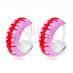 925 ezüst fűlbevaló félkör alakban, amely felületén kidomborodó fénymáz található, lila színben. A fülbevaló közepén piros sáv húzódik, szétfolyt szélekkel. Biztonságos viselését a zárszerkezete teszi lehetővé. Szélesség: 5 mmKülső átmérő: 10 mmBelső átmérő: 8 mmSúly 0,8 gFémjelzéssel ellátottAz ár egy párra vonatkozik.