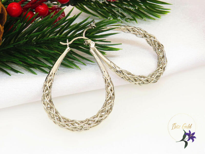 Antiallergén ovális alakú alul fonott fülbevaló Szin : rodium Méret: 4x3x0,6cm A forgalmazott divatékszerek alapanyaga nikkel és ólommentes ezért többnyire nem okoznak allergiás tüneteket, nyugodtan hordhatják fémérzékeny emberek is. Általában nem színezik a bőrt és más divatékszerekhez képest nagyságrendekkel jobb kopásállósággal rendelkeznek. A fehér (ezüst) szín