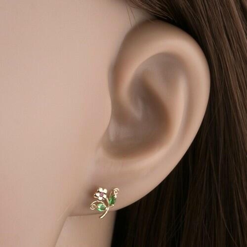 Fülbevaló 14K sárga aranyból színes virág alakban, melynek közepe színes rószaszín cirkónia öt lekerekített szirommal. A szár felszíne fényes és enyhén ívelt alakja van, miközben a szélein csavart levelek találhatóak zöld szem alakú cirkóniás dísszel. A fülbevaló kapcsolása stekkeres. Fülbevaló méretei: 9 x 8 mmSúly: 0,43 gFémjel - van. Az ár egy párra értend