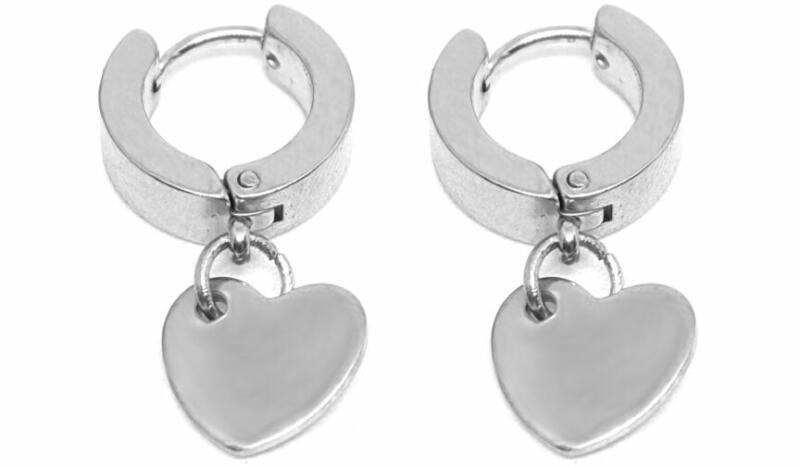 Ezüst színű nemesacél Szív fülbevaló. Paraméterek: A függő mérete kb. 1 cm. A színe ezüst, anyaga nemesacél. Akasztó rozsdamentes acélból készült.