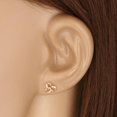 375 sárga arany fülbevaló, háromágú csomó - keltai szimbólum "Triquetra". A csomó vékony szalagokból tevődik össze, fényes felülettel. A csomó egyes részeit hat szimmetrikusan elhelyezett cirkónia díszíti. Zárszerkezete stekkeres. Méret: 7 x 6 mmSúly: 0,4 gFémjelzéssel ellátott. Az ár egy párra vonatkozik.