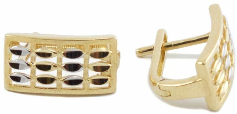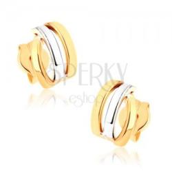 Fülbevaló 9K aranyból három ívelt vonalból, miközben kettő közülük sárga aranyból készült, a harmadik, középső ív felszíne pedig fehér arannyal díszített. A fölbevaló felszíne ródiummal van ellátva. Stekkeres kapcsolás. A fülbevaló méretei: 5 x 7 mm A fülbevaló súlya: 0,4 g Fémjelzéssel ellátott. Az ár egy párra vonatkozik. A ródiummal kezelt felület az é