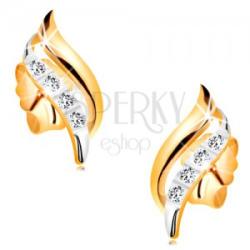 Kombinált 14K arany fülbevaló két hullám alakjában, sárga és fehér változatban. A sárga aranyból készült hullám felülete sima és enyhén lekerekített. A fehér aranyból készült hullámot apró, beültetett, átlátszó cirkóniák díszítik. Stekkeres kapcsolás. Fülbevaló méretei: 4 x 11 mmFülbevaló súlya: 0,5 gFémjelzéssel ellátott. Az ár egy párra vonatkozik.