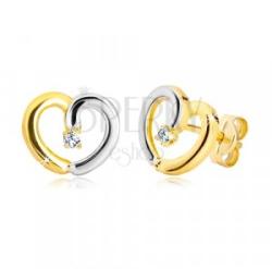 14K kombinált arany fülbevaló, szimmetrikus szív körvonal. Egyik oldalról sárga arany, másik oldalról fehér arany. Középen egy cirkónia helyezkedik el foglalatba ültetve. Zárszerkezete stekkeres. Fülbevaló mérete: 8 x 7 mmSúly: 0,5 gFémjelzéssel ellátott. Az ár egy párra vonatkozik.