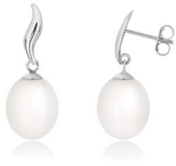585 fehér arany fülbevaló, vékony hullámos vonal. Az alsó részéről tenyésztett édesvízi gyöngy függ. A gyöngy színe fehér, ovális alakú. A fülbevaló felülete sima és fényes. Zárszerkezete stekkeres. Fülbevaló mérete: 8 x 20 mmGyöngy mérete: 8 x 10 mmSúly: 1,93 gFémjelzéssel ellátott. Az ár egy párra vonatkozik. A tenyésztett gyöngy apró idegen anyag behelyez