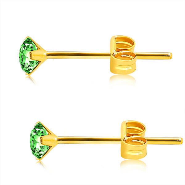 A 375 sárga arany fülbevalót egy csiszolt, kerek cirkónia díszíti. A csillogó cirkónia, amelyet karmok tartanak, világoszöld színárnyalatú. A fülbevaló felülete fényes és sima. Stekkeres zárszerkezet. A fülbevaló átmérője: 3 mmA fülbevaló súlya: 0,19 gFémjelzéssel ellátva. Az ár egy párra vonatkozik.