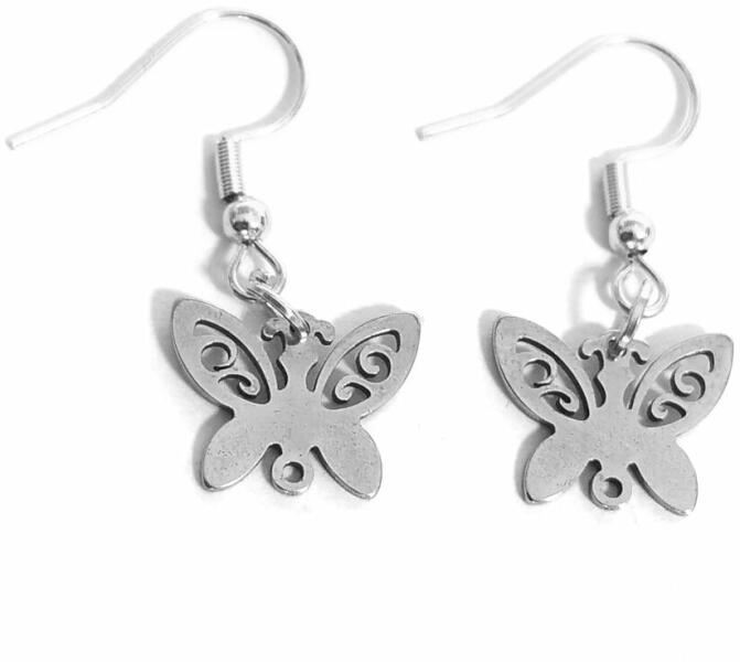 A függő színe nem választható, a képen látható színben küldjük. Az akasztó színét kiválaszthatod a listából, vagy írd be rendeléskor a megjegyzésbe. Alapesetben a képen látható összeállítást küldjük! Rozs damentes acél pillangó fülbevaló, választható arany vagy ezüst színű akasztóval. Paraméterek: A függő mérete 1,5x1,2 cm. A színe ezüst, a hozzá vála