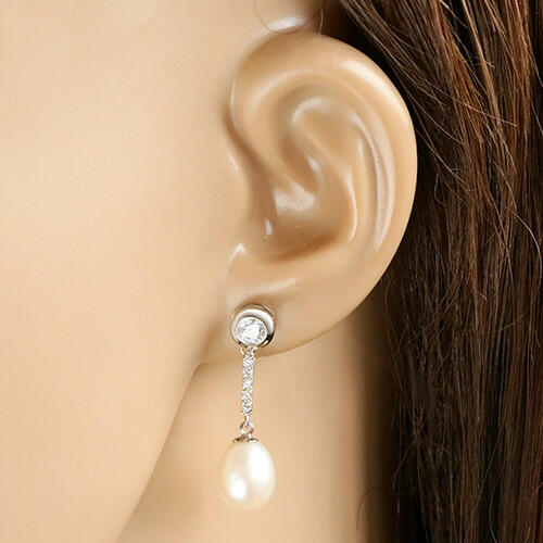 Az 585 fehér arany fülbevaló egy kerek átlátszó cirkóniából áll, amely egy sima foglalatba van helyezve és amelyen egy keskeny, cirkóniás téglalap alakú körvonal függ. Ezen egy nagy, fehér színű tenyésztett gyöngy függ. Stekkeres zárszerkezet. A fülbevaló mérete: 8 x 30 mmA fülbevaló súlya: 3,02 gFémjelzéssel ellátva. Az ár egy párra vonatkozik. A tenyésztett gy