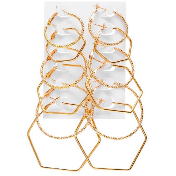 Ruby Fülbevalószett Ruby fülbevalószett szuper áron. A szett 12 pár különböző formájú, méretű és díszítésű fülbevalót tartalmaz. Nem tartalmaz nikkelt, ezért érzékeny bőrű emberek is viselhetik. Tulajdonságok: Anyaga: Fém és cink ötvözete Szín: Arany A fülbevalók mérete: 2,5cm - 5,5cm