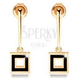 Fülbevaló 14K sárga aranyból kicsi négyzet körvonallal, amely egy vékony, lekerekített pálcikán függ. A négyzet kontúr egész kerületén fekete fénymázas sáv húzódik, a hátoldala pedig apró gravírozott pontokkal díszített. Biztonságos viselését stekker biztosítja. A fülbevaló méretei: 5 x 17 mmA fülbevaló súlya: 0,9 gFémjelzéssel ellátott. Az ár egy párra von