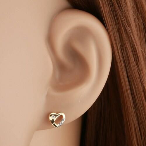 A 14K arany fülbevaló egy kis szimmetrikus szívből tevődik össze, amelyet az egyik oldalon egy kivágás és fehér aranyból készült vonal díszít, gravírozott pontokkal. A szív másik, teljes oldalán egy kerek, átlátszó, csillogó felületű briliáns van beültetve. Biztonságos viselését stekker teszi lehetővé. Fülbevaló méretei: 7 x 6 mmEgy gyémánt átmérője: 1,25 mm