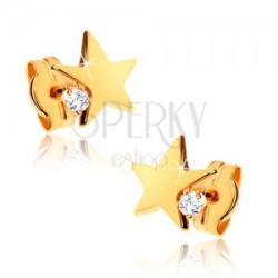 Beszúrós fülbevaló 9K sárga aranyból, ötágú csillag alakkal, mely szélén kerek átlátszó cirkónia van ültetve. A fülbevaló stekkeres kapcsolású. A fülbevaló méretei: 7 x 7 mm A fülbevaló súlya: 0,3 g Fémjelzéssel ellátott. Az ár egy párra vonatkozik.