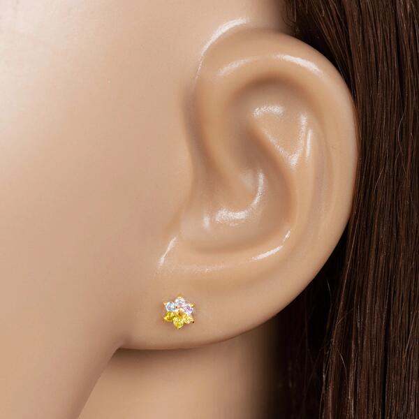 375 aranyból készült fülbevaló virág alakban, hat darab cirkóniával sárga, zöld, kék, lila és tiszta színben díszítve. A színek sorrendje véletlenszerű. A cirkóniák hat fogas foglalatba vannak ágyazva, és hét foggal vannak rögzítve. A fülbevaló stekker zárral rendelkezik. A fülbevaló mérete: 5 x 5 mmA fülbevaló súlya: 0,53 gFémjel - van. Az ár egy párra vonatko
