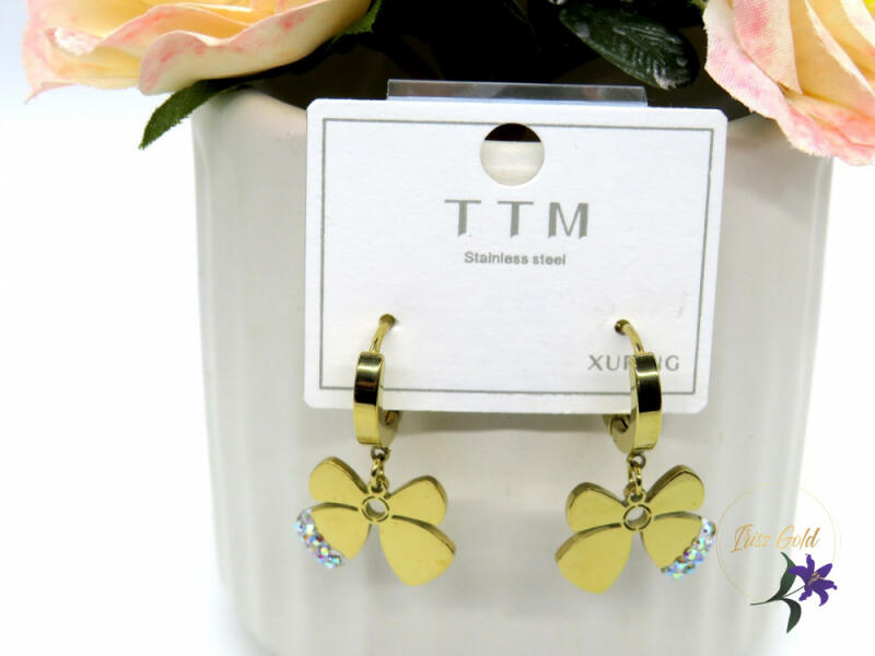 Gyönyörű pillangó nemesacél fülbevaló pici csillogó kövekkel Szin: 18 Kr Méret:25x18 mm Zár Karika :10 mm A forgalmazott divatékszerek alapanyaga nikkel és ólommentes ezért többnyire nem okoznak allergiás tüneteket, nyugodtan hordhatják fémérzékeny emberek is. Általában nem színezik a bőrt és más divatékszerekhez képest nagyságrendekkel jobb kopásállósággal rende