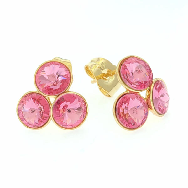 Aranyszínű fülbevaló, melyet sötét rózsaszín Swarovski kristályok tesznek csillogóvá. A kristályok ragasztott, peremezett foglalatban helyezkednek el. Időtálló ékszer, nem kopik, víz hatására nem feketedik. Antiallergén ékszer. 18K arany színben kapható. Fülbevaló mérete: 13 mm x 13 mm. Az antiallergén ékszerek olyan fémötvözetből készülnek, melyek nem irritáljá