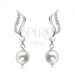 A 925 ezüst fülbevalót két hullámos vonal alkotja - az egyiket beültetett átlátszó cirkóniák díszítik míg a másik sima fényes felületű. Az alsó részen egy fehér színű, gömb alakú szintetikus gyöngy van odafogatva. Biztonságos viselését stekker teszi lehetővé. Fülbevaló méretei: 6 x 25 mmGyöngy átmérője: 6 mmFülbevaló súlya: 2,2 gFémjelzéssel ellátott. Az