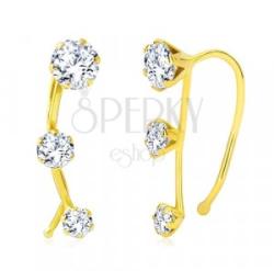 A Crawler fülbevaló 14K sárga aranyból ív alakú, amely a fül vonalát másolja. Az ívet három, fokozatosan növekedő kerek, átlátszó cirkónia díszíti foglalatba ültetve. A fülbevaló hullámos horogra van fogatva. Fülbevaló méretei: 4 x 17 mmCirkóniák átmérője: 4 mm, 3 mm és 2,5 mmFülbevaló súlya: 0,8 gFémjelzéssel ellátott. Az ár egy párra vonatkozik.