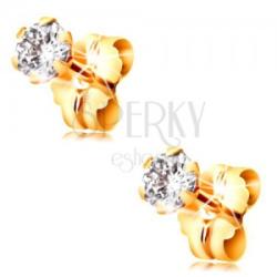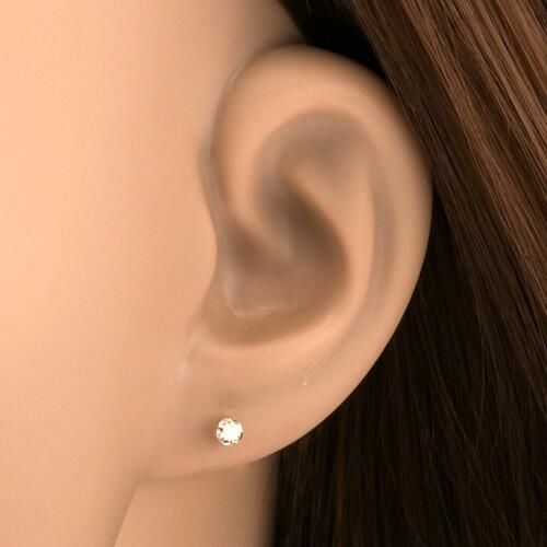 14K sárga arany fülbevaló kerek csiszolt átlátszó cirkóniával, mely négy fényes vékony karom segítségével van megfogva. A fülbevaló kapcsolása stekkeres. A fülbevaló átmérője: 3 mmSúly: 0,35 gFémjelzéssel ellátott. Az ár egy párra vonatkozik.