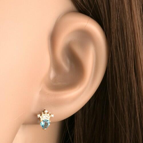 Korona alakú 9K sárga színű arany fülbevaló, amelynek a felső része kerek, átlátszó cirkóniákkal van kirakva és alatta kék árnyalatú, csiszolt topáz szívvel van díszítve. Biztonságos viselését a stekker biztosítja. A fülbevaló méretei: 7 x 9 mmA fülbevaló súlya: 0,5 gFémjelzéssel ellátott. Az ár egy párra vonatkozik.