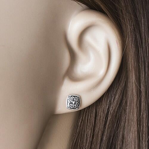 A 925 ezüst fülbevaló négyzet alakú enyhén lekerekített oldalakkal. A négyzetet fekete patina és szív alakú ornamentumok díszítik. Középen egy kiemelt apró golyó helyezkedik el. Biztonságos viselését stekker teszi lehetővé. Fülbevaló méretei: 7 x 7 mmFülbevaló súlya: 1,21 gFémjelzéssel ellátott. Az ár egy párra vonatkozik.