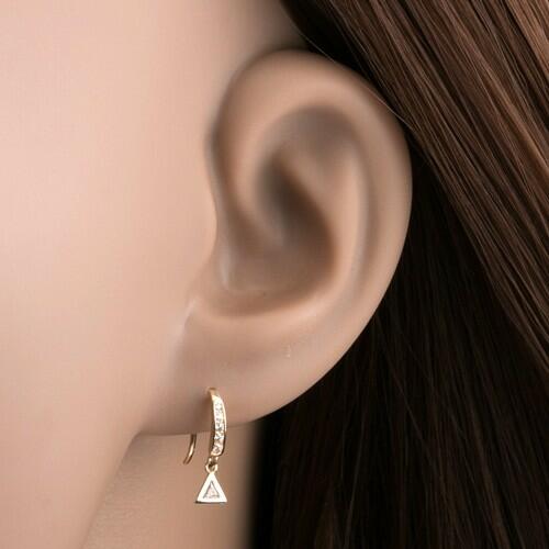 Fülbevaló 14K sárga aranyból fejecskéből, mely első része szélesedik és apró átlátszó cirkóniák díszítik. A horgon kis háromszög függ fényes felszínnel és átlátszó cirkóniával a közepében. Fülbevaló mérete (kapcsolással): 4 x 14 mmSúly: 0,5 gFémjelzéssel ellátott. Az ár egy párra vonatkozik.