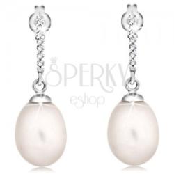A fehér 585 arany fülbevaló egy keskeny, függőleges ívből tevődik össze, amelyet beültetett, csillogó, átlátszó cirkóniák díszítenek. Az ív alatt egy nagy, ovális, fehér színű gyöngy található. A gyöngy tenyésztett. Biztonságos viselését stekker teszi lehetővé. Fülbevaló méretei: 8 x 23 mmFülbevaló súlya: 2,4 gFémjelzéssel ellátott. Az ár egy párra vonat
