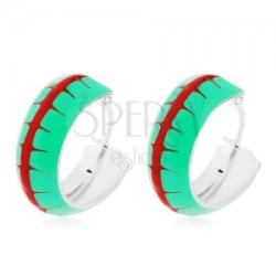 Fülbevaló 925 ezüstből nem teljes karika alakkal. A felszíne zöld fénymázzal borított és piros színű középső sáv díszíti tépett szélekkel. A fülbevaló kapcsolása egy ív bepattintása a szemben lévő nyílásba. Szélesség: 5 mmKülső átmérő: 14 mmBelső átmérő: 11 mmSúly: 1,2 gFémjelzéssel ellátott. Az ár egy párra vonatkozik.