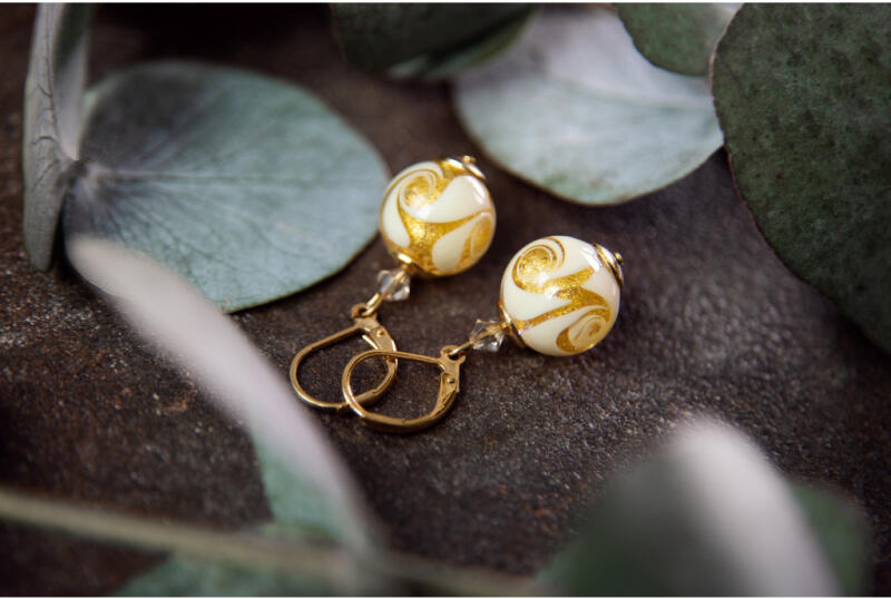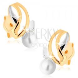 Bedugós fülbevaló sárga 375 aranyból, melyet két ívelt vonal alkot, ellentétesen egymásra helyezve. A telt vonal ezüst színű míg a másik ívelt vonal sárga színű arany. A vonalak alatt egy tenyésztett gyöngy található fehér színben. Biztonságos viselését a stekker biztosítja. A fülbevaló felülete ródiummal kezelt. A fülbevaló méretei: 5,5 x 10 mmA fülbevaló súl