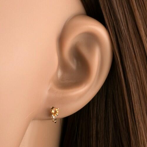 Bedugós fülbevaló 9K sárga aranyból csiszolt szív alakú citrinnel sárga árnyalatban, amely alatt egy fényes masni található lógó, hullámos szalagvégekkel. Biztosnágos viselését stekker biztosítja. A fülbevaló méretei: 3 x 8 mmA fülbevaló súlya: 0,36 gFémjelzéssel ellátott. Az ár egy párra vonatkozik. Az anyag természetes eredetéből adódóan az egyes drágakövek