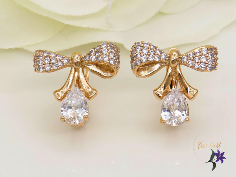 Gyönyörű masni fülbevaló fehér csüngős cirkóna kővel Szin: 18 Kr Méret:15x14 mm Zár: francia kapocs A forgalmazott divatékszerek alapanyaga nikkel és ólommentes ezért többnyire nem okoznak allergiás tüneteket, nyugodtan hordhatják fémérzékeny emberek is. Általában nem színezik a bőrt és más divatékszerekhez képest nagyságrendekkel jobb kopásállósággal rendelkezn