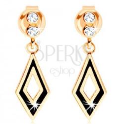 Fülbevaló 9K sárga aranyból átlátszó cirkóniák kettősével, amelyek alatt egy rombusz alakú körvonal függ fekete árnyalatban. A hátsó oldal fényes és egyenes, miközben gravírozott pontok díszítik. Biztonságos viselését stekker biztosítja. A fülbevaló méretei: 5 x 15 mmA fülbevaló súlya: 0,7 gFémjelzéssel ellátott. Az ár egy párra vonatkozik.