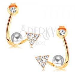 Fülbevaló 14K sárga aranyból kerek átlátszó foglalatba ültetett cirkóniával, melyhez nem teljes cseppkörvonal van hozzáfogva. A körvonal ívelt részébe fehér gömbölyű gyöngy van behelyezve és a végén ragyogó háromszög található, apró átlátszó cirkóniákkal gazdagon díszítve. A fülbevaló kapcsolása stekkeres. Méret: 11 x 14 mmSúly: 1,3 gFémjelzéssel elláto