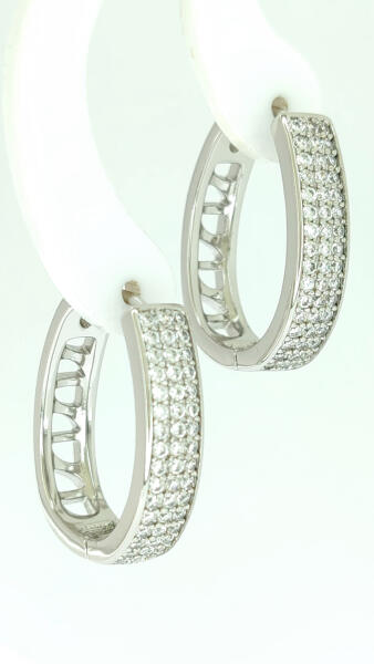 Ezüstszínű hosszított fülbevaló, melyet fehér cirkónia kristályok tesznek csillogóvá. A kristályok karmos foglalatban helyezkednek el, a fülbevaló elülső oldalát díszítik, hátulja áttört mintás. Időtálló darab, nem kopik, nem feketedik, nem színezi a bőrt. Antiallergén ékszer, nem okoz panaszokat fémérzékeny hölgyeknek sem. Fülbevaló belső átmérője: 21 mm. F