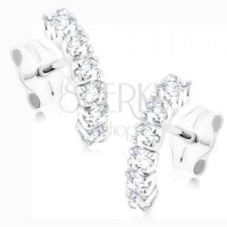 Fülbevaló 9K fehér aranyból félhold alakban beültetett, átlátszó, kerek cirkóniákkal. Biztonságos viselését stekker biztosítja. A fülbevaló méretei: 2 x 10 mmA fülbevaló súlya: 0,8 gFémjelzéssel ellátott. Az ár egy párra vonatkozik.