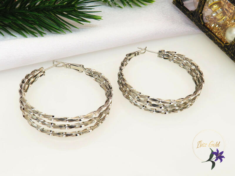 Antiallergén háromszálas karika fülbevaló Szin: rodium Méret: 4cm /3-3-3 mm A forgalmazott divatékszerek alapanyaga nikkel és ólommentes ezért többnyire nem okoznak allergiás tüneteket, nyugodtan hordhatják fémérzékeny emberek is. Általában nem színezik a bőrt és más divatékszerekhez képest nagyságrendekkel jobb kopásállósággal rendelkeznek. A fehér (ezüst) színű