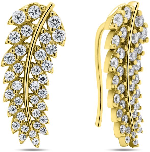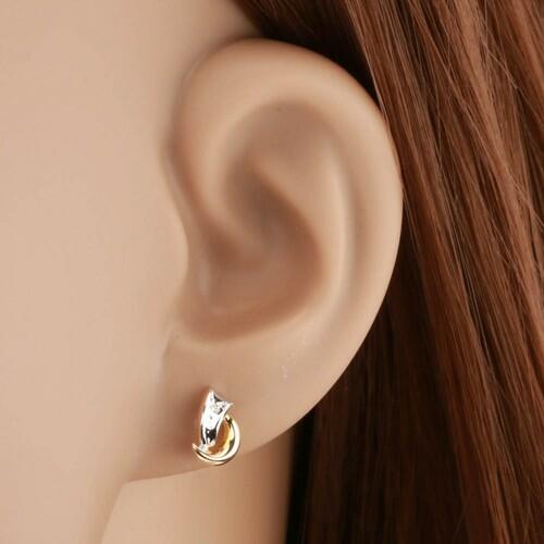 A 14K arany fülbevalót két ellentétesen hajlított ív alkotja. A vékony, sárga arany ívnek tükörfényes, sima felülete van és félholdra emlékeztető alakja. A fehér aranyból készült ív apró, gravírozott pontokkal és beültetett, átlátszó cirkóniával van díszítve. Biztonságos viselését stekker teszi lehetővé. Fülbevaló méretei: 6 x 8 mmA fülbevaló súlya: 0,4