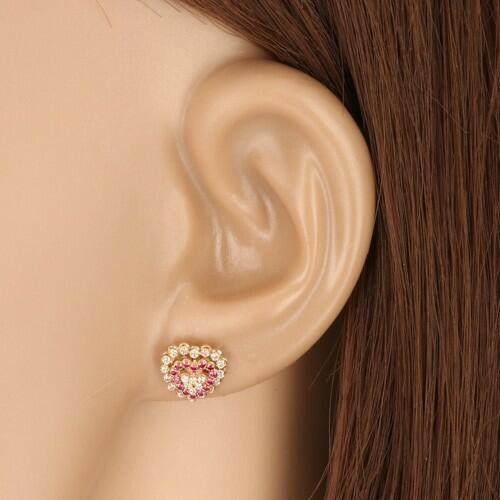 9K sárga arany fülbevaló, szabályos szív alakban. A teljes felületét cirkóniák díszítik. Két féle színű, csiszolt cirkónia - pirosas rózsaszín és átlátszó. Felülete fényes, zárszerkezete stekkeres. Fülbevaló mérete: 9 x 9 mmSúly: 1 gFémjelzéssel ellátott. Az ár egy párra vonatkozik.